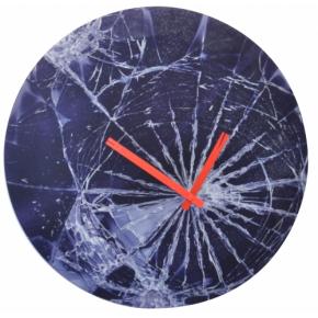 De NeXtime Crash wandklok is van glas en bedrukt met de print van een gebroken glasplaat. Het uurwerk bevindt zich rechts van het midden, in het hart van de breuk. De rode wijzers zijn opvallend waardoor eenvoudig de tijd is af te lezen. Afm. Ø43cm